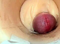 "Camera deep inside tight pussy captures huge cum explosion, wet and shaved."