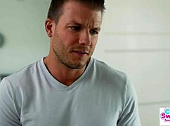 My stepsister casually agrees to sex on the floor with the brunette babysitter